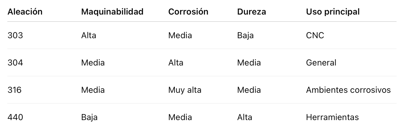 Ferrosas: contienen hierro (ej. acero inoxidable 303, 304, 316, 440)